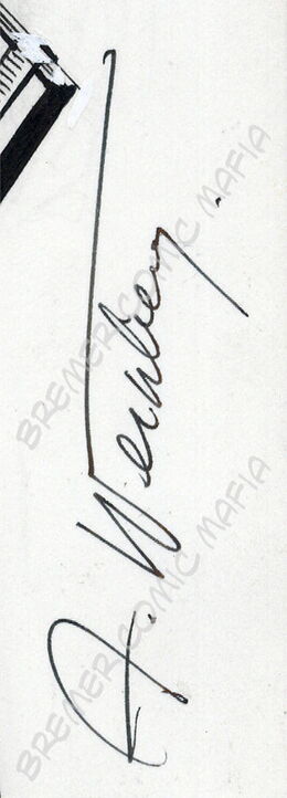 Le dessin en noir et blanc a été signé de la main d'Albert Weinberg à droite, à la hauteur du genou de Dan Cooper. La feuille de papier originale est protégée par un papier fin et semi-transparent.