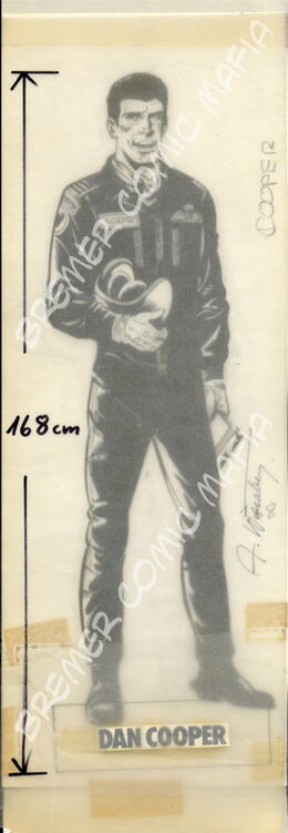 Le dessin lui-même n'est pas déchiré et se trouve dans un bel état. Au niveau des pieds, un autre petit morceau de papier semi-transparent a été collé avec du scotch. Sur celui-ci, l'inscription Dan Cooper est montée. Le scotch a laissé des traces à quatre endroits sur le carton à dessin blanc. Le dessin lui-même n'en est toutefois pas affecté. La taille est d'environ 43 x 14,5 cm.