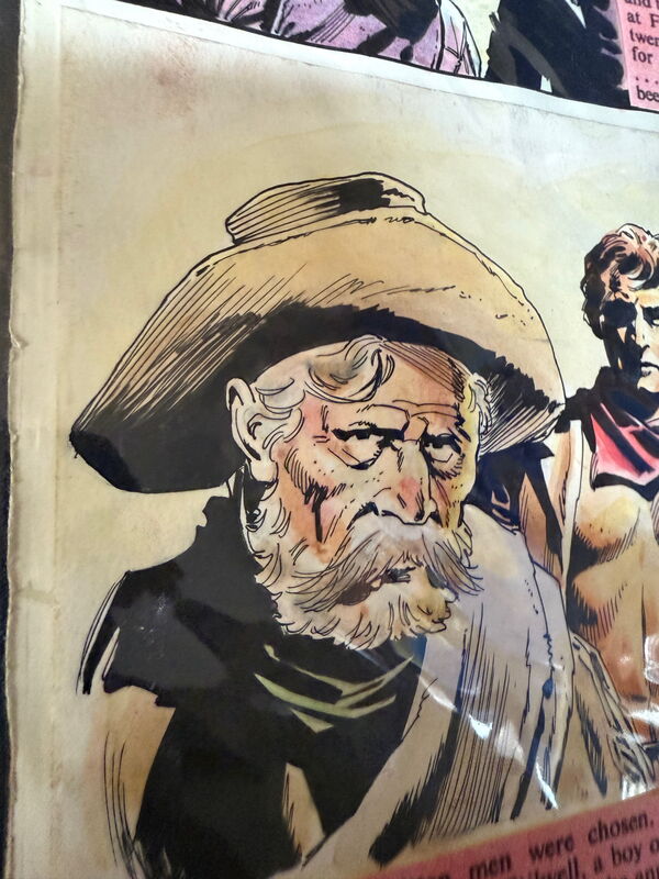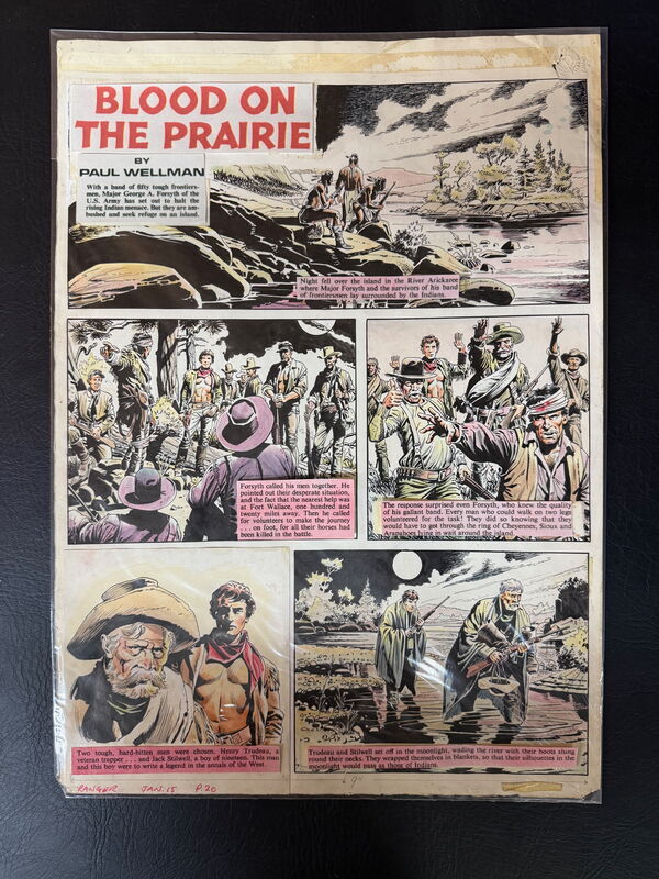 Die Zeichnung selber befindet sich in einer Folie. Auf diese Folie wurden die englischen Texte geklebt. Zeichner ist nicht angegeben. Wir vermuten, dass es sich um Alberto Giolitti handelt. Giolitti zeichnete auch die beliebte Comicreihe Turok. Ca. 51 x 36 cm.