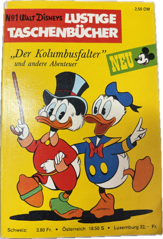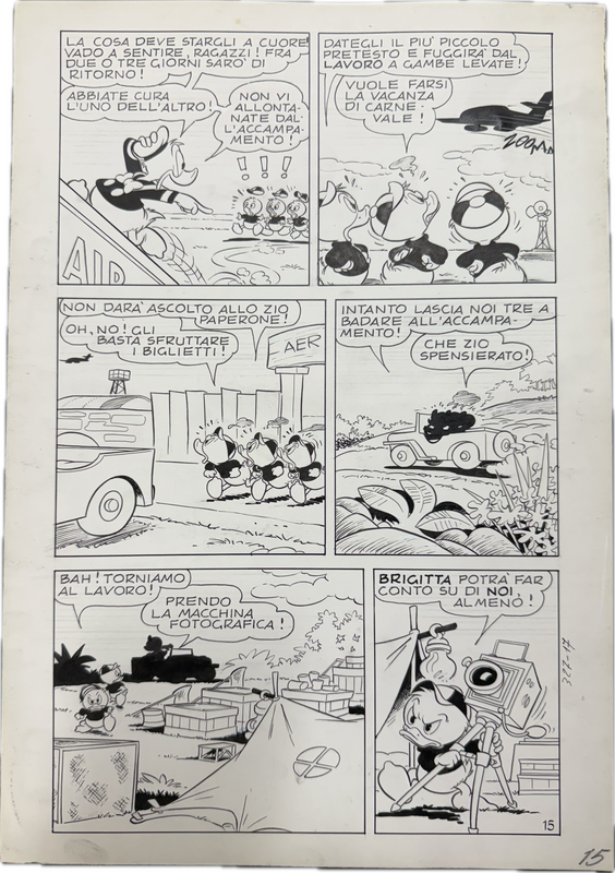 Sensationell! Originalseite aus dem legendären Disney Taschenbuch „Der Kolumbusfalter“. Abgedruckt als Seite 35 des Taschenbuchs. Story und Zeichnung stammt von Romano Scarpa. Dieser schrieb laut Duckipedia „die Geschichte in Anlehnung an die Karnevalszeit“ in der „jeder Scherz zählt“.