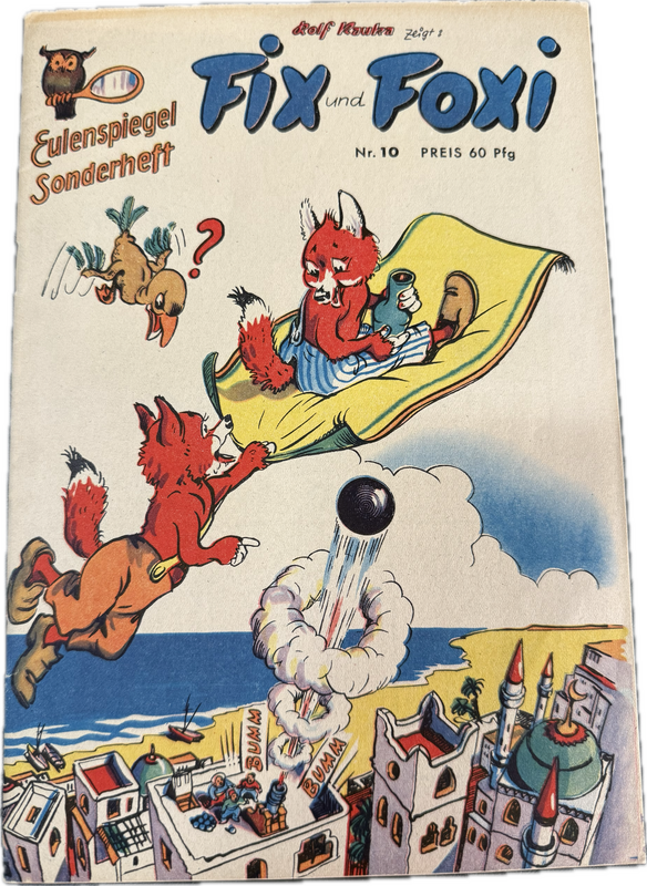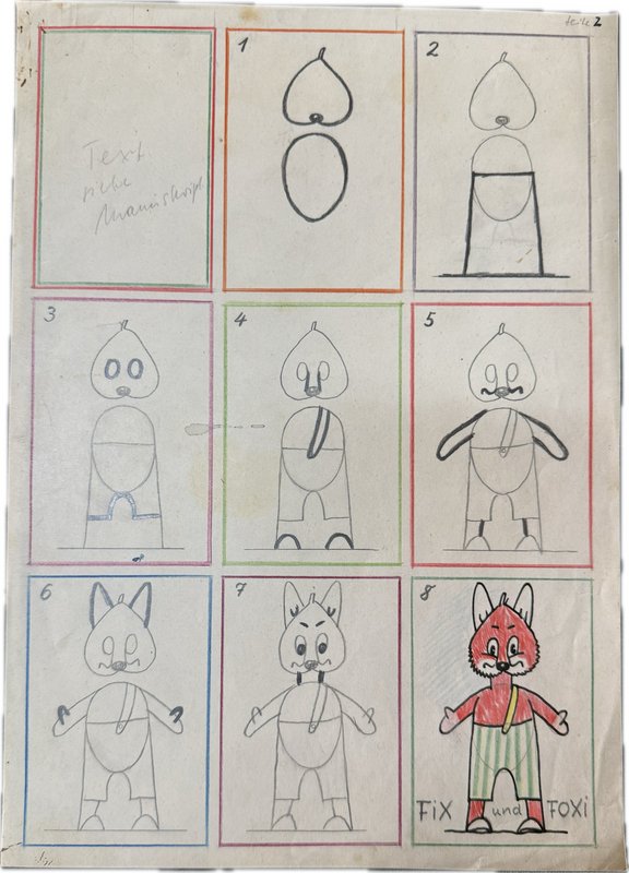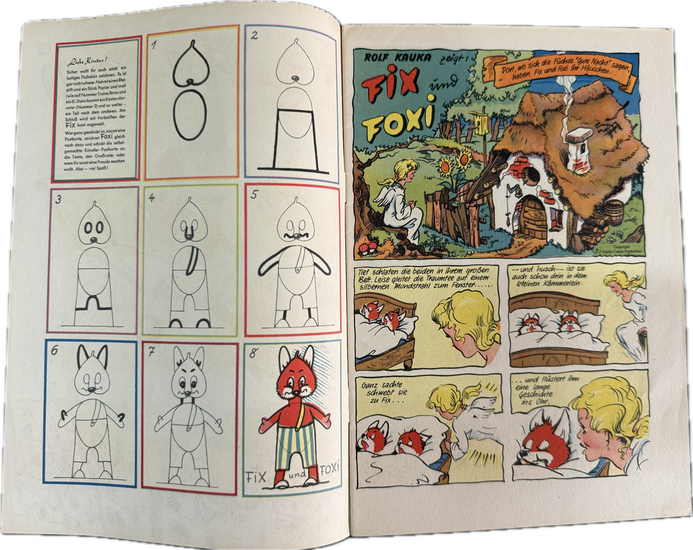 Aus der ehemaligen Sammlung Krumm stammt diese Kuriosität. Nachdem unter dem Titel „Till Eulenspiegel“ bei Pabel schon die ersten Geschichten mit den beiden Füchsen erschienen waren (In den Ausgaben 6-9) bekamen die Vierbeiner mit Heft 10 ihre eigene Serie. Auf Seite 2 dieses Hefte erschien dann diese Seite, die die Leser ermuntern sollte eigene Fix und Foxi Figuren zu Papier zu bringen, Ca. 29,5 x 21 cm. Ein Stück Comicgeschichte, die wohl aus der Feder von Werner Hierl stammt. Sehr schön im Zustand. (Heft wird natürlich nicht mitgeliefert)