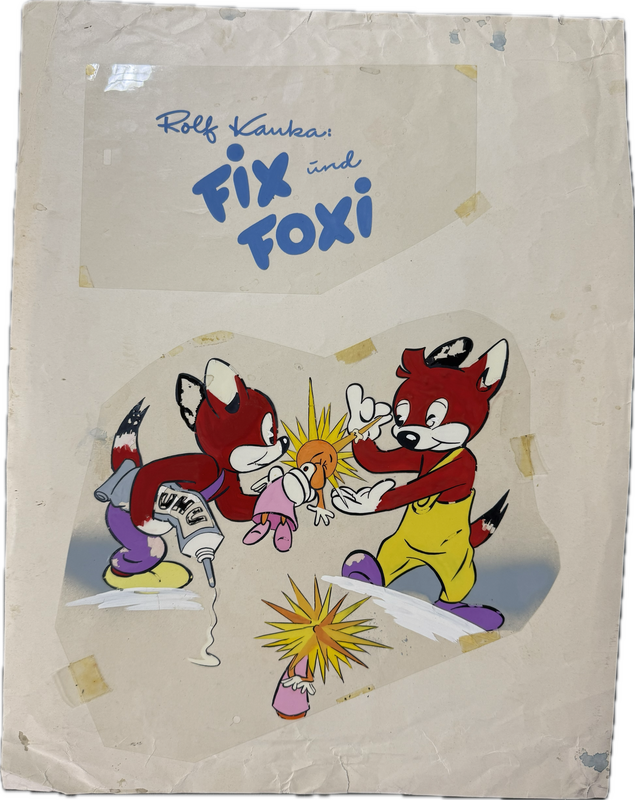 Es gab unterschiedliche Möglichkeiten Zeichnungen anzufertigen. Alle Farben direkt auf Papier. Die bunten Farben auf Papier und die schwarzen Kontraste auf Klarsichtfolie quasi oben drauf oder alle Farben von hinten auf Folie. Letztere Variante liegt hier vor. Gestaltung lässt eigentlich ein Titelbildentwurf vermuten. Umgesetzt wurde dieses aber als Seite 4 des Heftes 55. Zeichner Dieser sollte Hierl gewesen sein. Mit Uhu wurde schon früh zusammengearbeitet. Ehemals Sammlung Krumm. Größe der Füchse ca. A4. (Ohne Schriftzug)