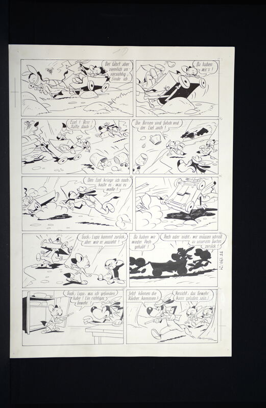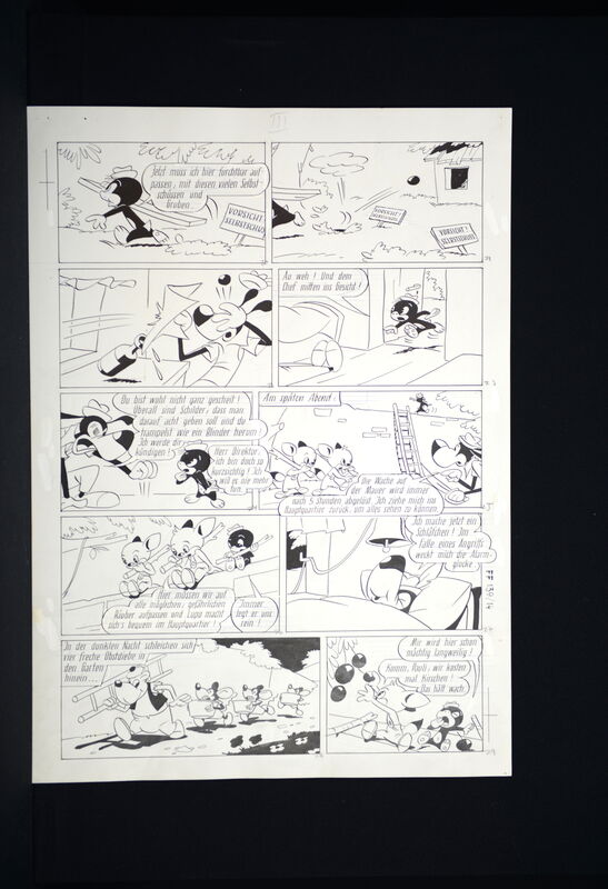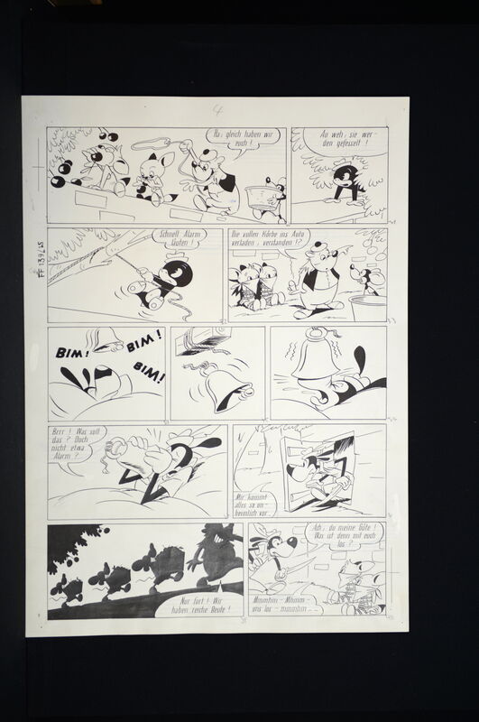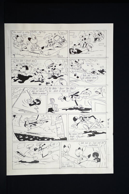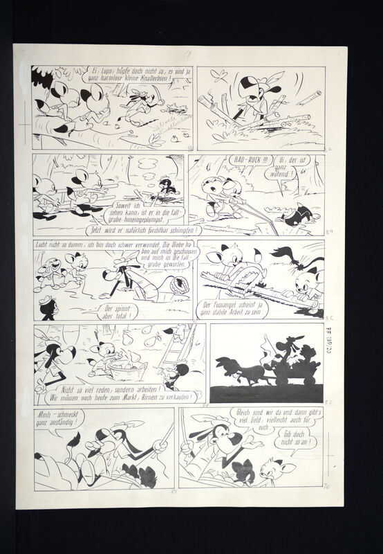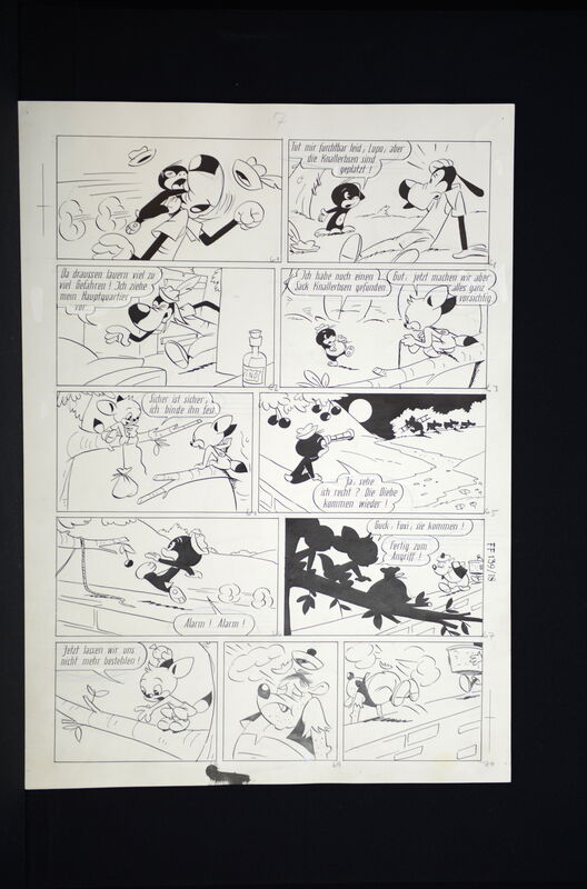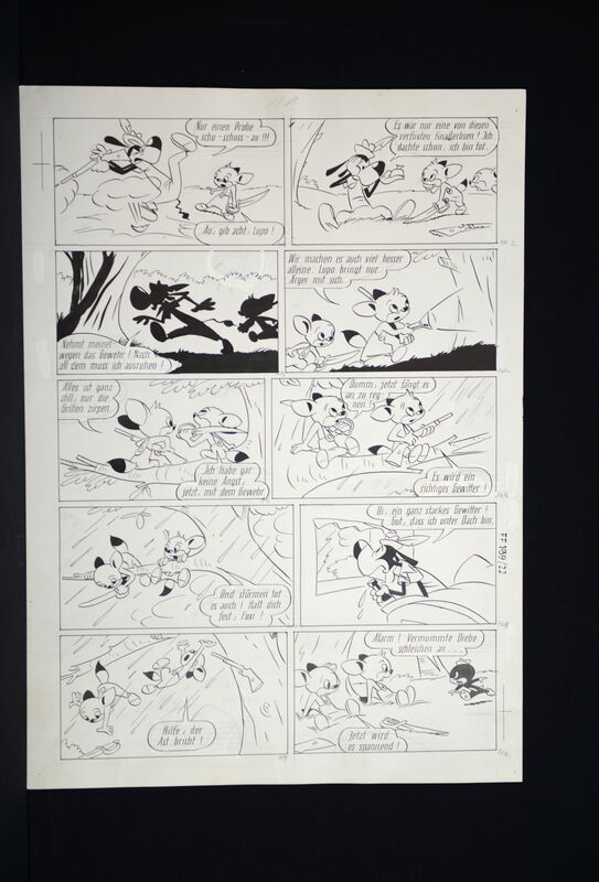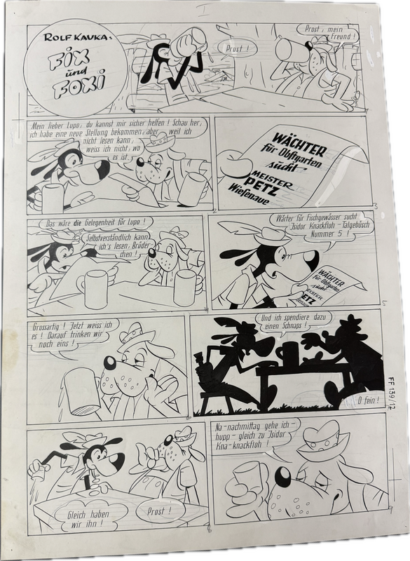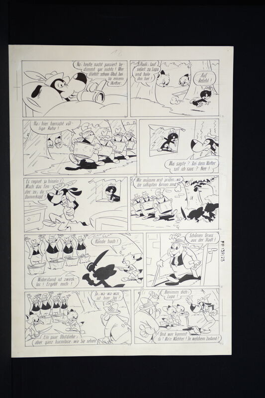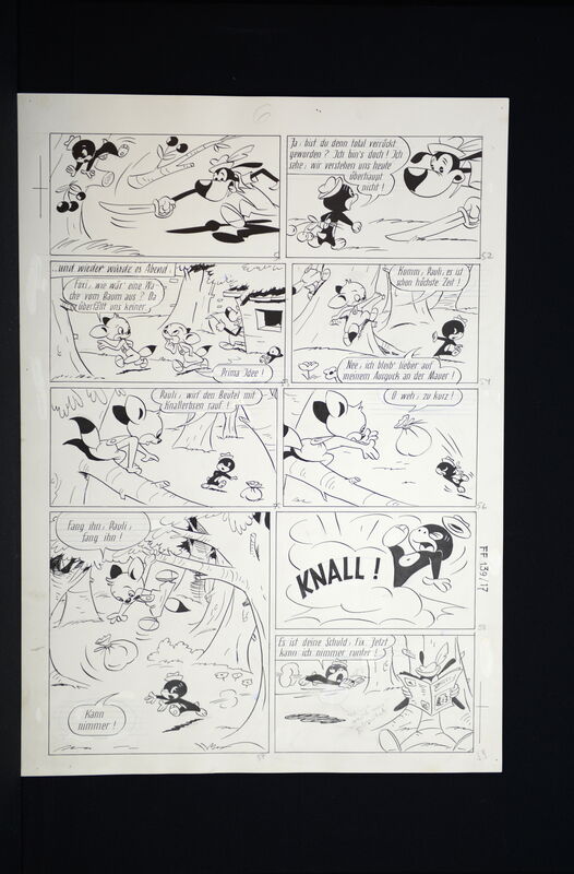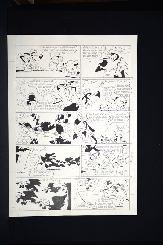 Hier verkaufen wir die kompletten dreizehn Seiten dieser herrlichen Fix und Foxi Story in der auch Pauli vertreten ist. Seiten befinden sich alle in schöner Erhaltung. Ca. 51 x 36,5 cm. Natürlich alles Unikate. Frühe Geschichte, Lupo mit untypischen Hut.