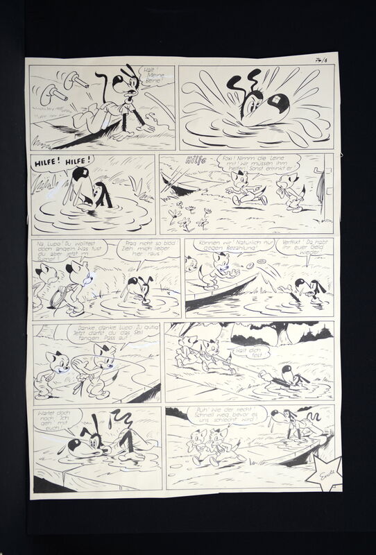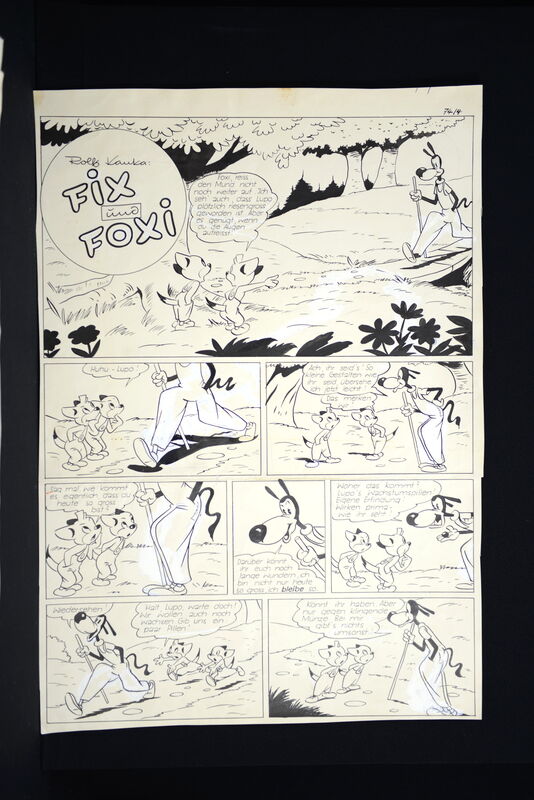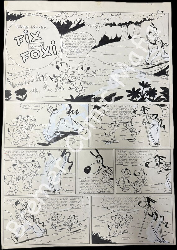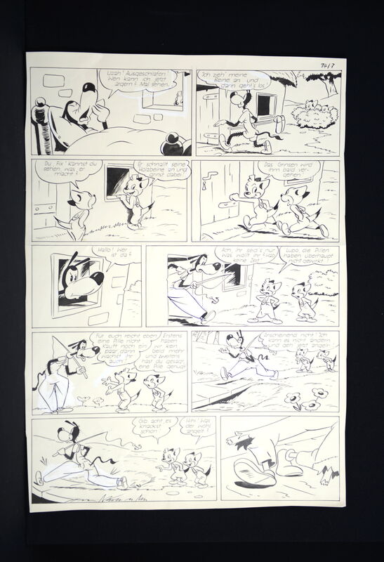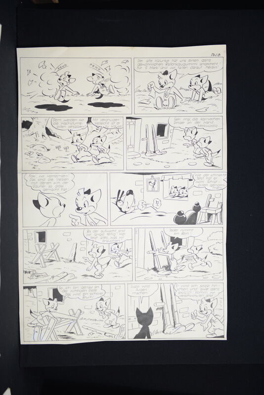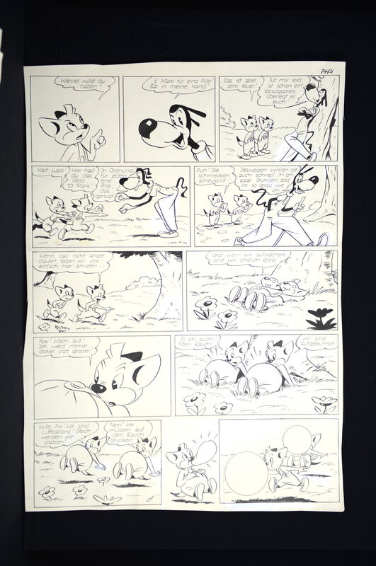 Fix und Foxi und der Kaugummi - 5seitige Originalseitenstory aus dem Jahr 1956. Erstabdruck erschienen in Heft 74. Zeichner wohl Braunmüller oder Espenmüller. Jede Seite natürlich ein Unkat. Größe ca. 53 x 38,5 cm. Toller Erhaltungszustand.