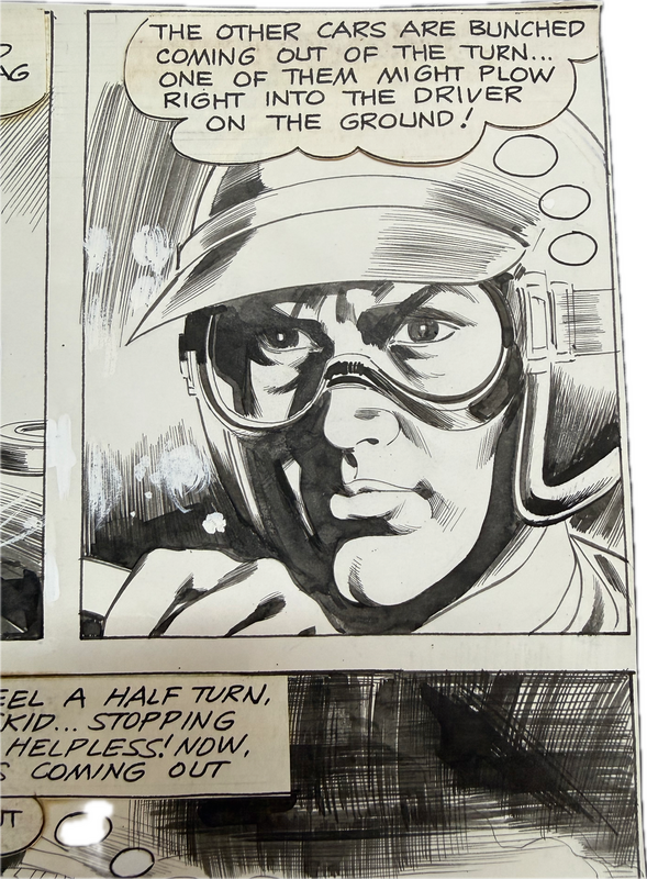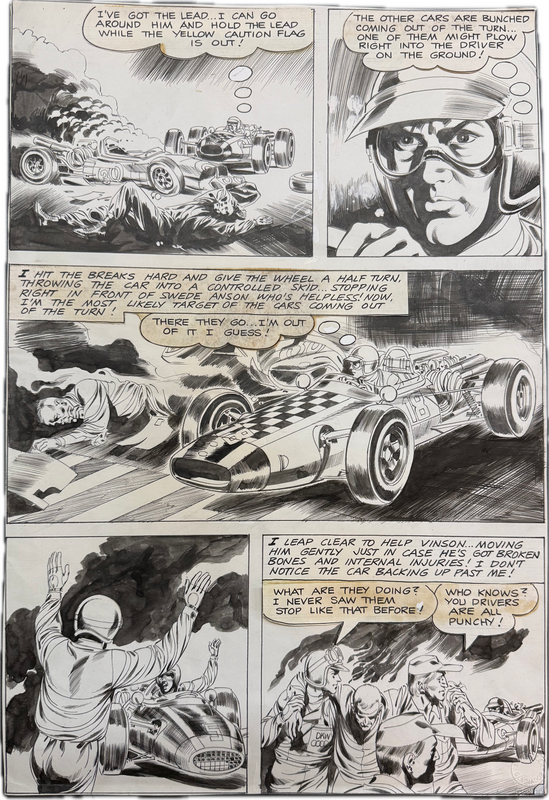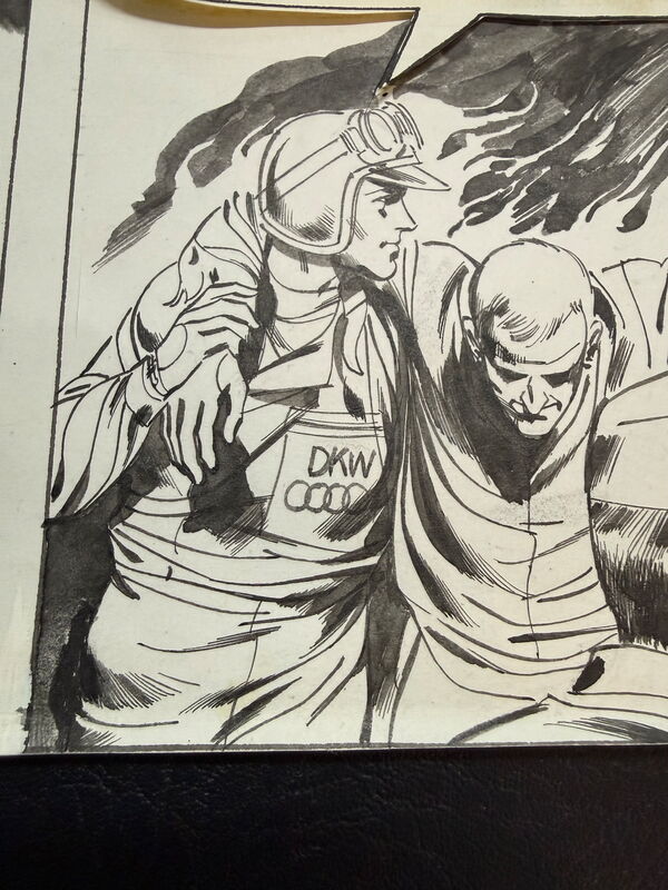 Fantastische Seite, die wir allerdings weder einer bestimmten Reihe noch einem Zeichner genau zuweisen können. Im letzten Bild unten rechts gibt es einen Hinweis zur deutschen Marke DKW (Dampf Kraft Wagen) Auto Union. Angefertigt 1969.