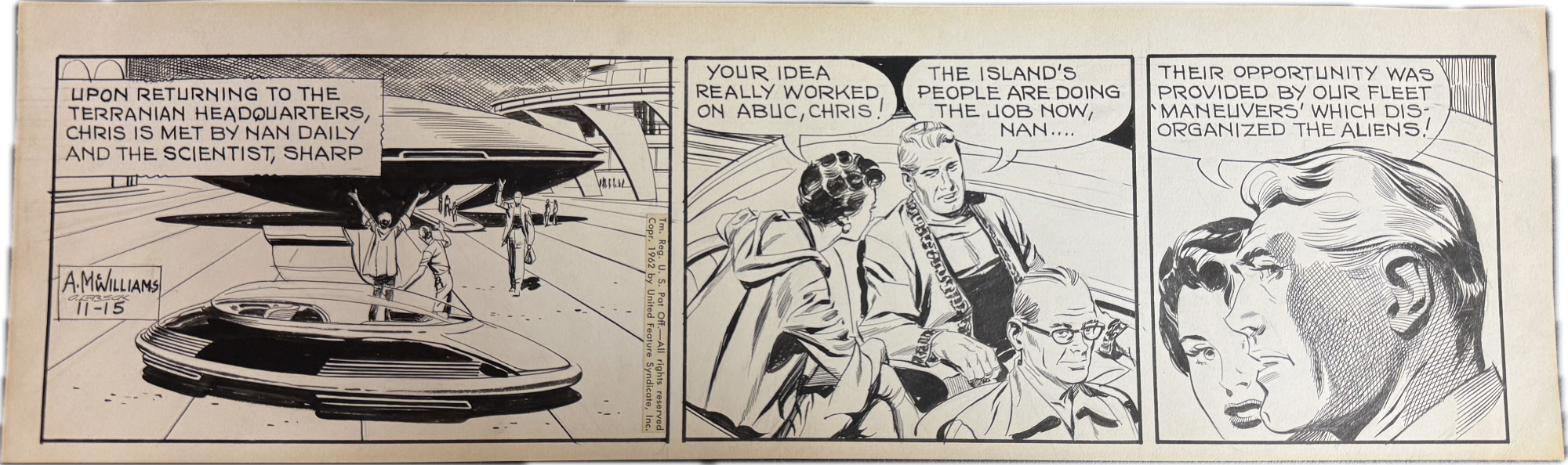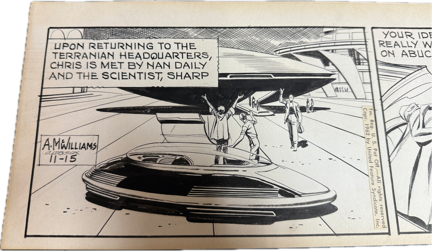 Sehr schöner Streifen, der (wie früher üblich) in einer Sonntagszeitung abgedruckt wurde.Tolle Darstellung zweier Ufos. Ca. 15,5 x 51 cm. Sehr schön im Zustand.Zustand: 0-1-