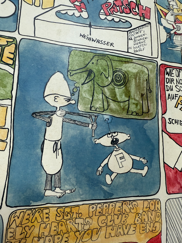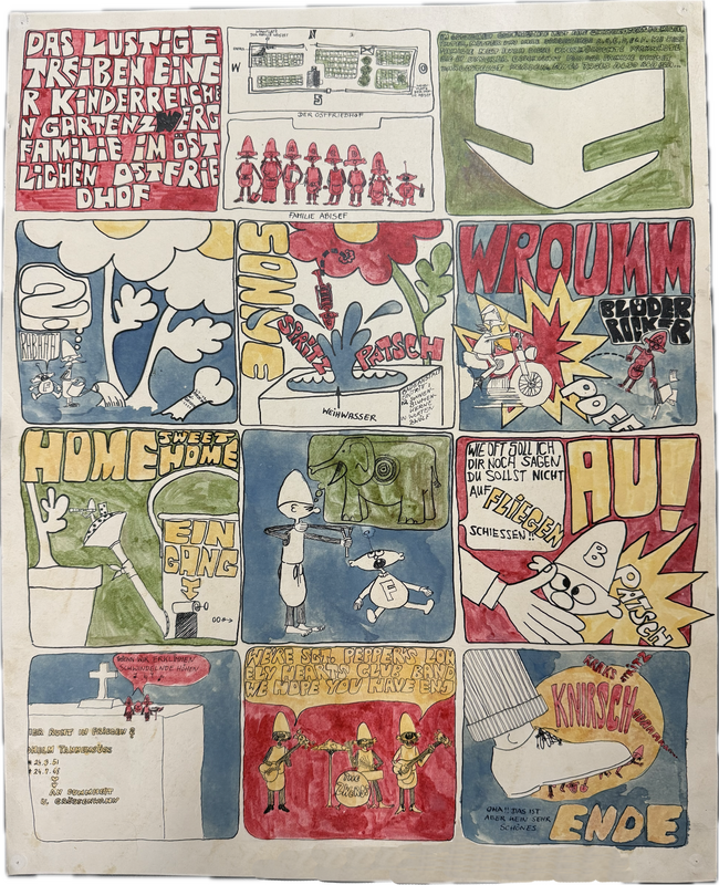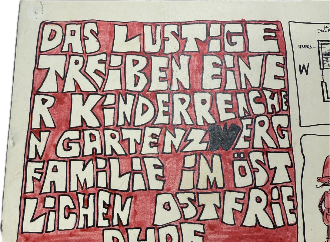 Titel: Das lustige Treiben einer kinderreichen Gartenzwergfamilie im östlichen Ostfriedhof. Sehr schön im Zustand.Ca. 51 x 41 cm.
