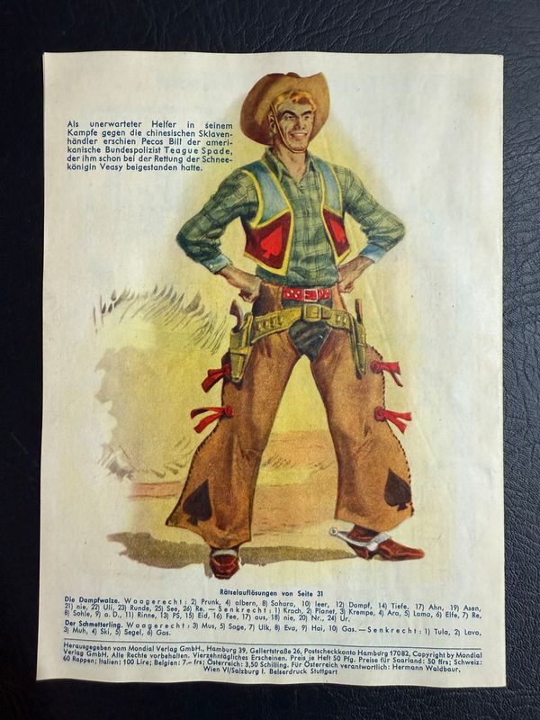 Heft befindet sich in einem schönen 1er Zustand. Keine Risse, keine Knicke und keine rostigen Klammern. Wir haben nicht alle unserer tollen Pecos Bill fotografieren können. Deswegen unbedingt auch unter Großbänden P noch nach fehlenden Heften gucken.