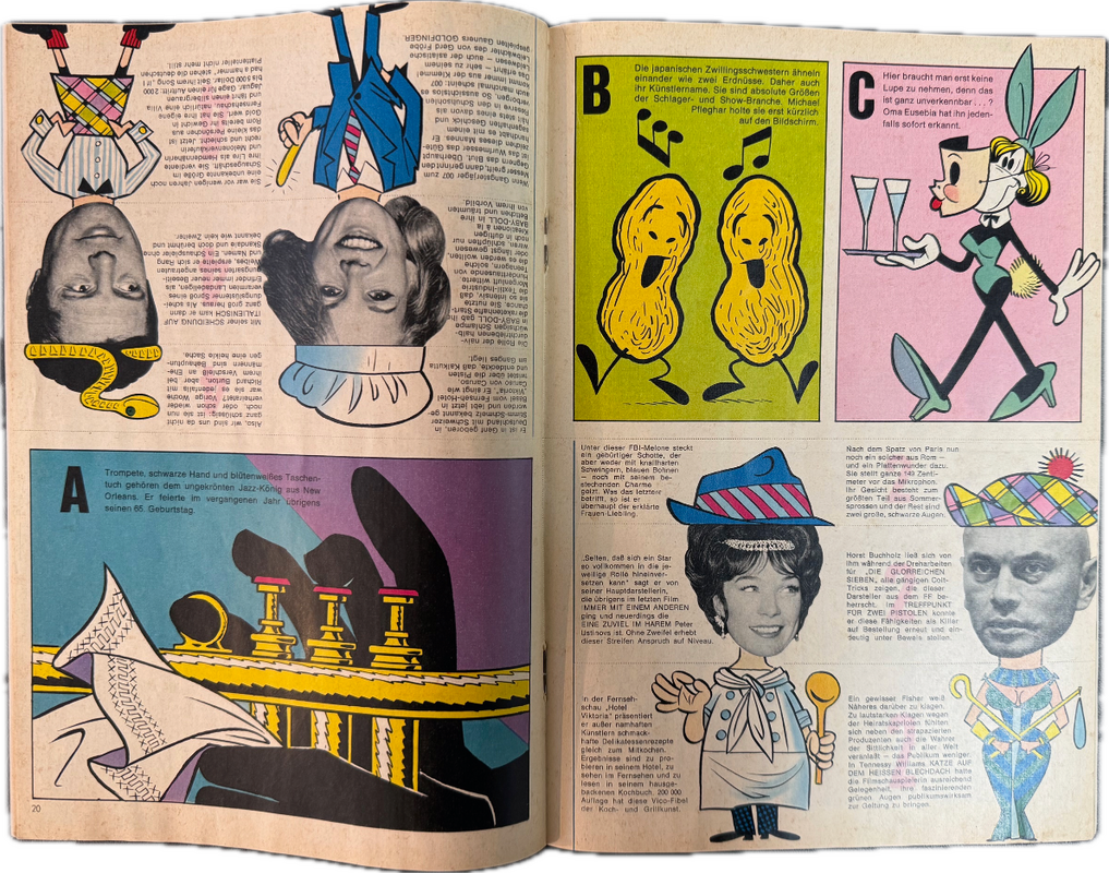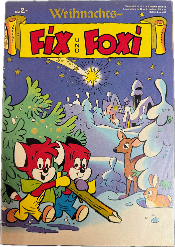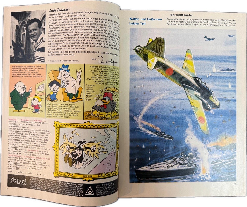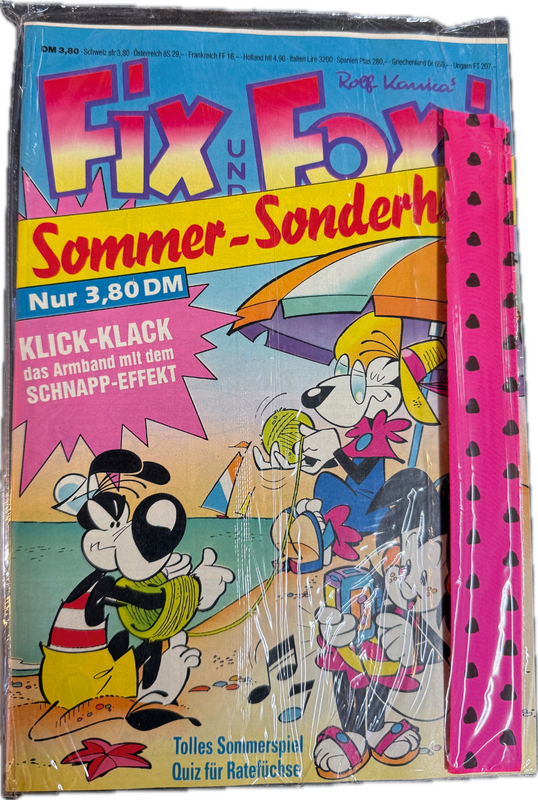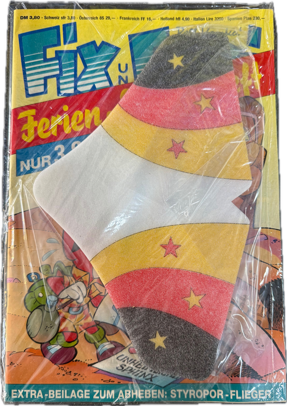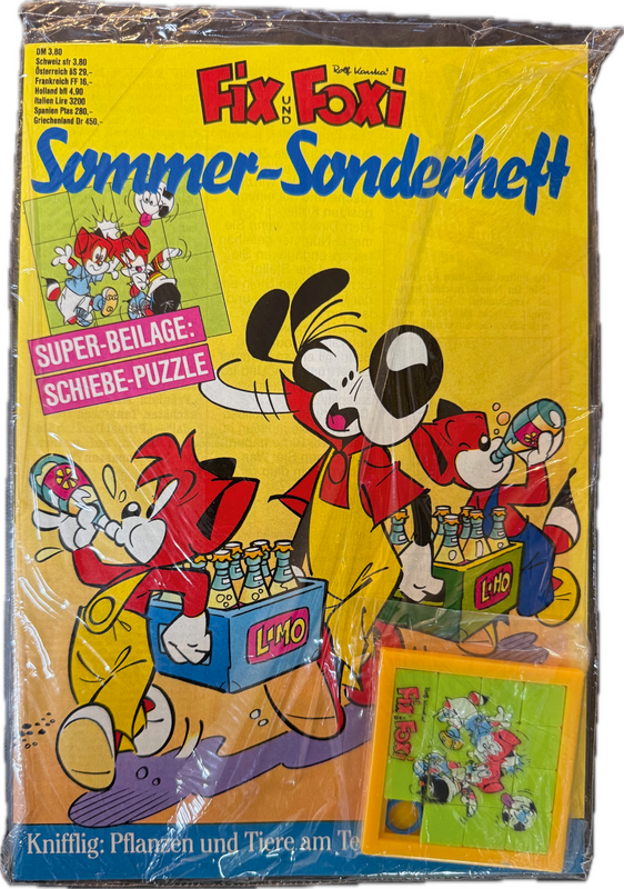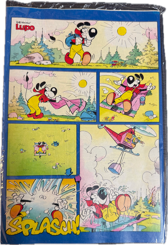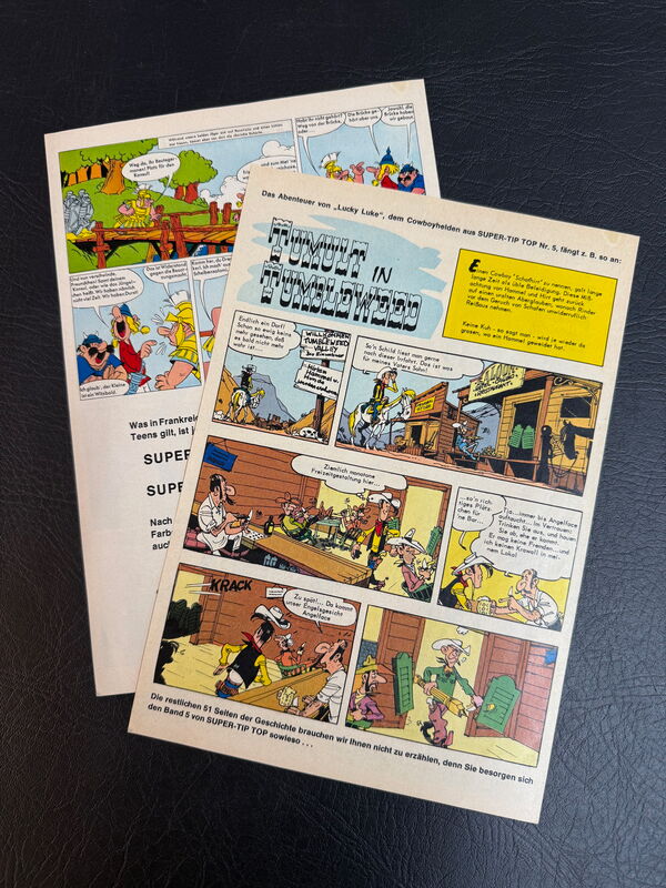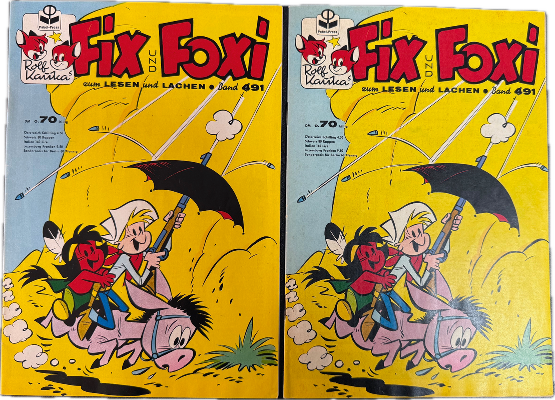 Aus der ehemaligen Sammlung von Chris Krumm stammt auch diese Rarität. Besonders ist hier die links zu sehende Ausgabe, denn diese erinnert an die Exportausgaben der Mosaik Reihe, die bezüglich ihrer Papierbeschaffenheit des Umschlags gänzlich anders sind, als die der normalen Hefte. Es wiegt 64 Gramm und nicht wie gewöhnlich ca. 47 Gramm. Die „Ich weiß mehr“ Seiten wurde hier nicht in der Mitte, sondern vorne und hinten integriert. Die Mittelseite mit „Stars und Sterne“ (ähnlich Lupo Modern) gestaltet.