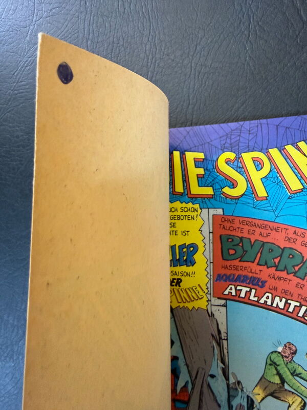 Heft kommt eigentlich druckfrisch daher. Wir würden eigentlich mit „Top“ bewerten, was 0- entspricht. Doch auf der Rückseite des Titelbildes befindet sich ein kleiner Kulikreis. Dennoch denken wir hier von einem sehr guten Zustand sprechen zu können. Eine ganz, ganz feine Rarität, die so nur alle 10 Jahre mal auftaucht. Enthält Spinne 20 und Horror 8Zustand: 1-