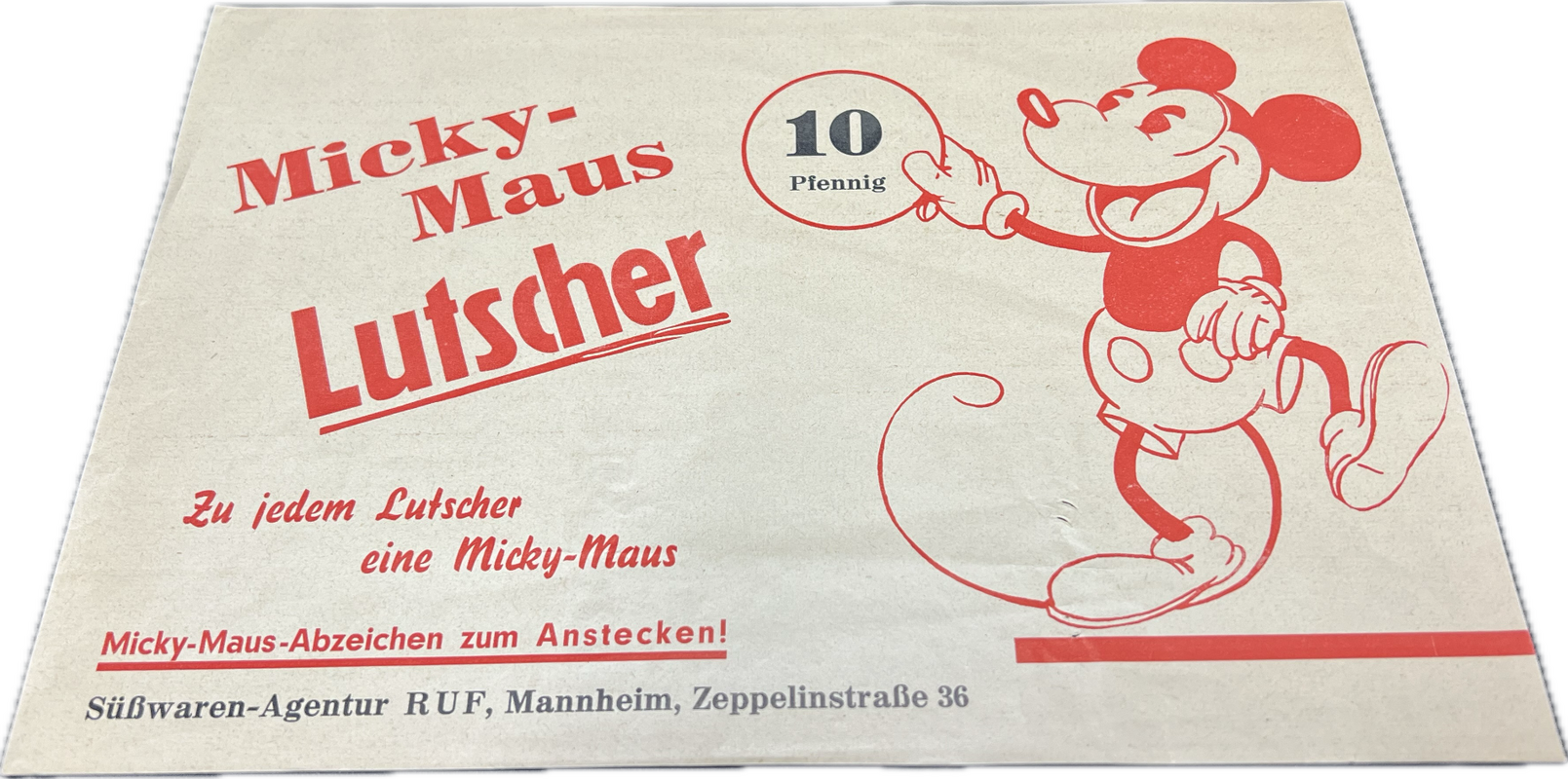 Süßwaren-Agentur Ruf - Ankündigungskleinplakat für Micky Maus Lutscher (Um 1950)